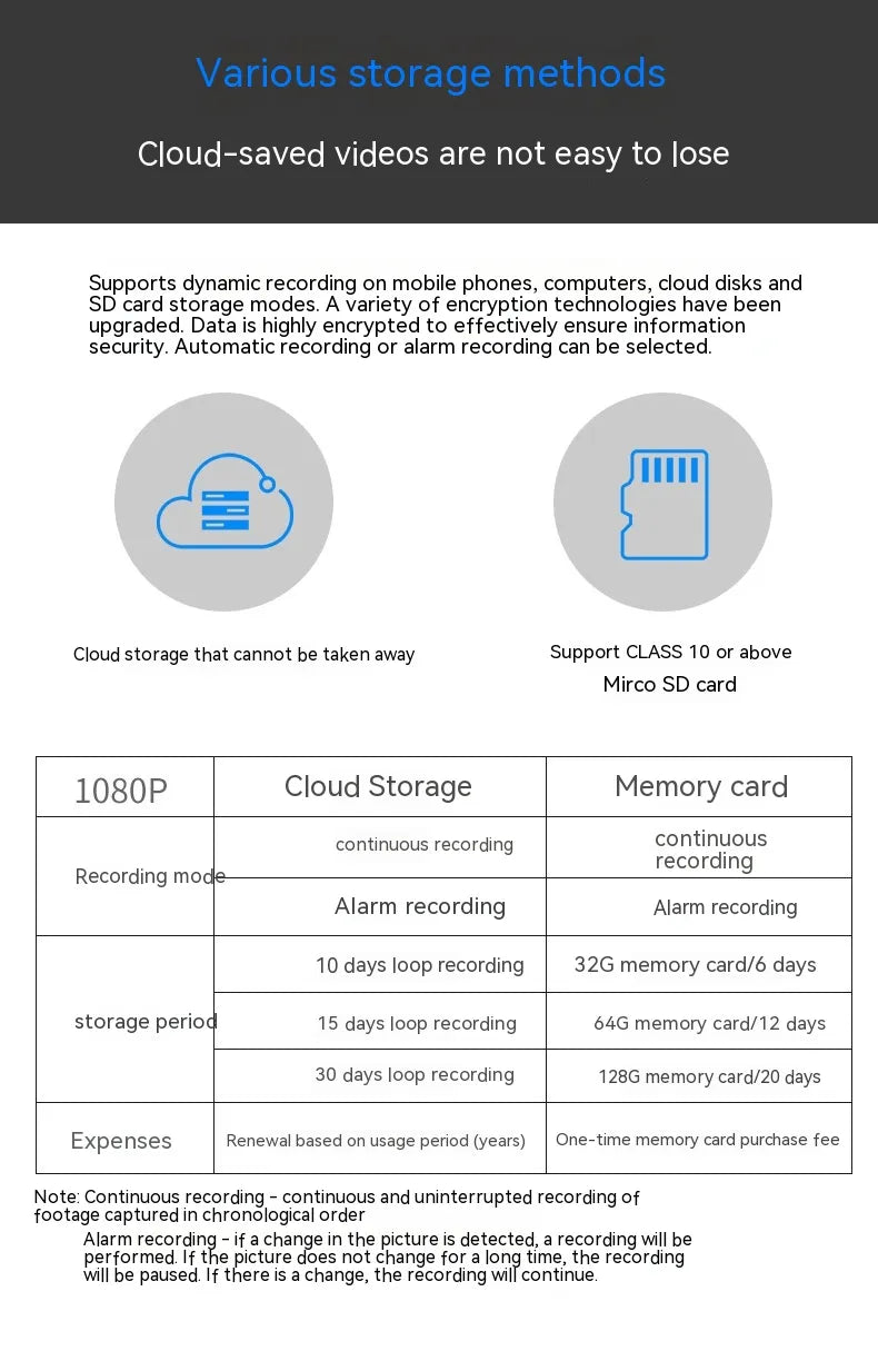 - Storage: Secure cloud storage with optional local storage via microSD card (up to 128GB)