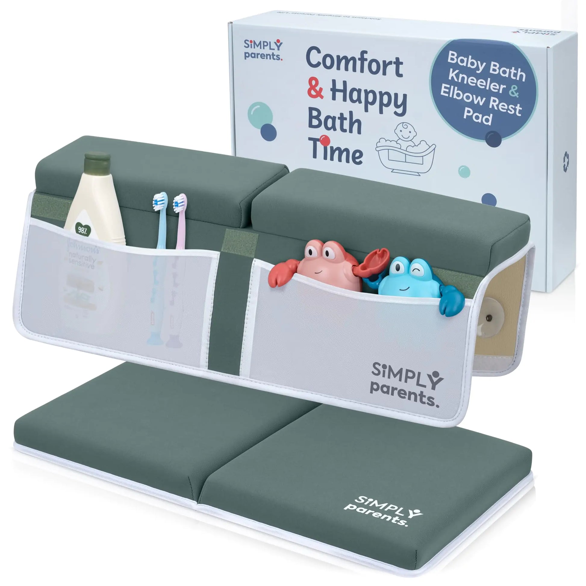 [ULTIMATE COMFORT SUPPORT - Made with memory foam and neoprene our bath knee pad for bathing baby set provides cushioned support for your knees and elbows. Enjoy a comfortable bath time with your little one! ENHANCED STABILITY & SECURITY - Equipped with 8 suction cups and a non-slip rubber bottom the baby bath support for the tub set stays firmly in place. Installation is easy giving a secure fit without slipping. "EXTRA-LARGE STORAGE - Our baby bathtub kneeling pad features 4 spacious pockets to organize bath-time essentials. Keep everything within arms reach for a smoother effortless routine." "EASY TO STORE & CLEAN - The hanging loops make drying and storing efficient; ideal for small bathrooms with the rest of your bath time essentials for baby. Moreover its easy to clean with a wipe or in the washing machine" GIFT-READY PACKAGING - Our padded kneeling bath mat for tub for baby is ideal for gifting on baby showers birthdays Christmas and more. Wrap it as a thoughtful present for new parents or parents of young children who are dear to you.]